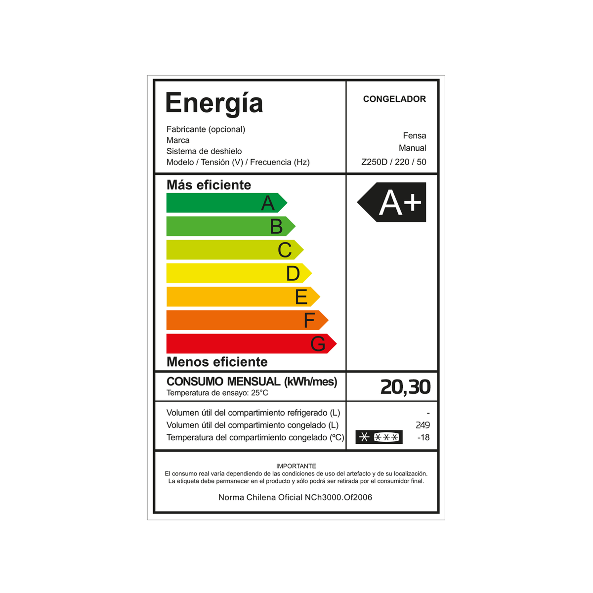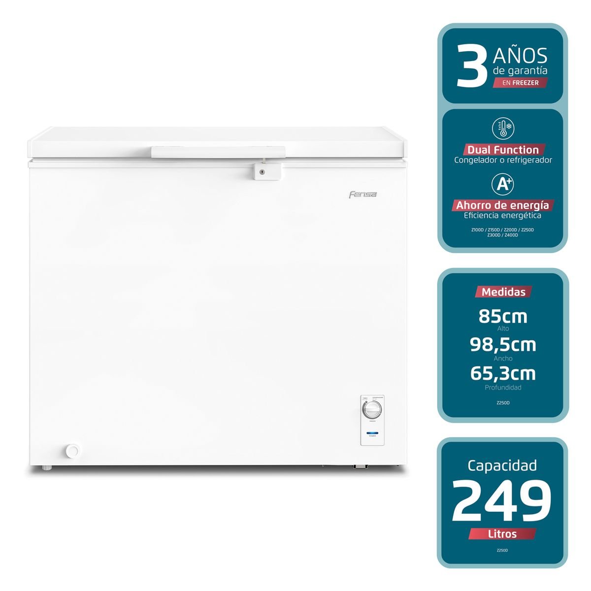 El Congelador Horizontal Fensa 249L Z250D tiene un bajo consumo de energía a través de la clasificación «A+», y con Dual Function tiene doble función que controla la temperatura para el modo congelador o refrigerador, garantizando la mejor conservación de sus alimentos y bebidas.
