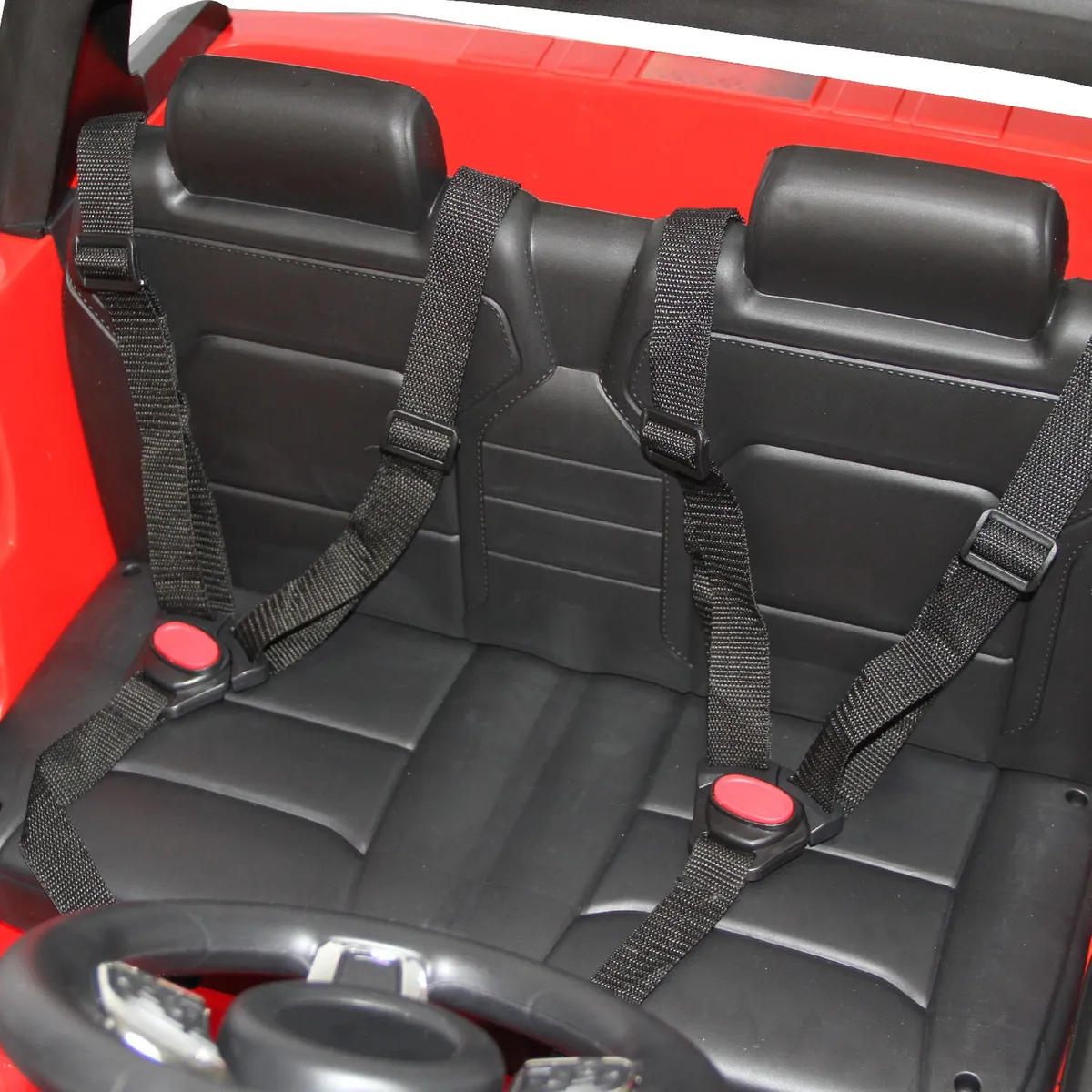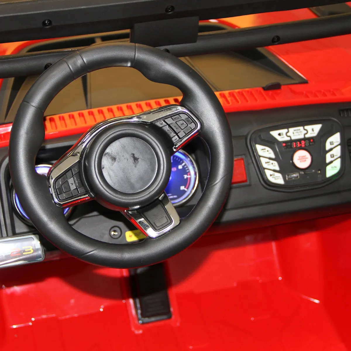 Información adicional: Tus hijos se sentirán como los más grandes aventureros de la ciudad con el Jeep Bebeglo RS-5965, este vehículo está diseñado para ser usado por dos niños a la vez, un conductor y su copiloto. El vehículo es grande y ancho, la altura del piso a la pisadera es de 36 cm., es recomendado para niños más grandes entre 3 y 8 años aprox., el auto soporta un máximo de 50 Kg, tiene 2 cinturones de seguridad de 3 puntos para que ambos niños vayan protegidos. Las puertas tienen pasador de seguridad, solo se pueden abrir desde dentro, estas se abren y cierran en forma independiente. En su parte trasera los niños pueden cargar pequeños objetos o juguetes. El auto tiene sonido de encendido de motor, al encenderlo el tablero se ilumina, el manubrio incluye sonido de bocina y de selección de entretenidas melodías incorporadas, el completo tablero de controles incluye marcha adelante y atrás, avance y retroceso de música, botón de conexión Bluetooth, botón de control de luces delanteras y traseras, botón de funciones, entrada puerto USB, puerto auxiliar y tarjeta TF card. El vehículo cuenta con dos motores de 35W, marcha hacia adelante y hacia atrás, el control remoto se conecta por Bluetooth.