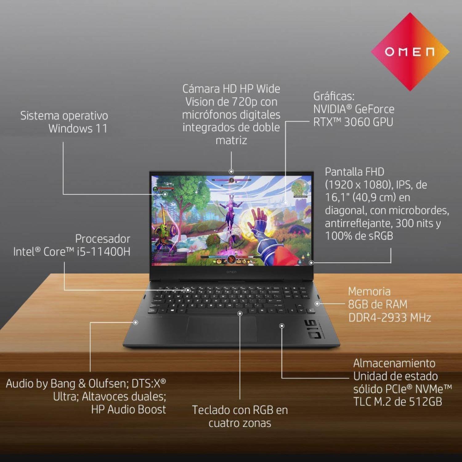 - Sistema de audio: Audio by Bang & Olufsen; DTS:X Ultra; Altavoces duales; HP Audio Boost