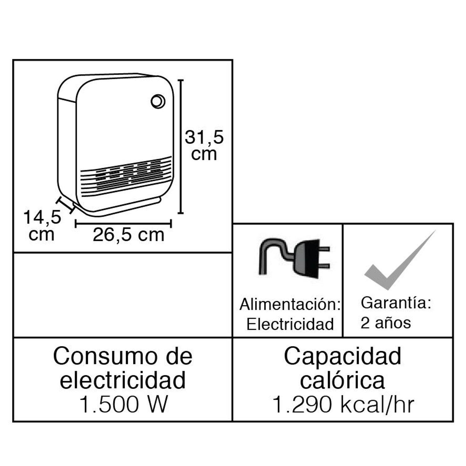 Cuenta con dos niveles de potencia que permiten seleccionar entre 750 y 1500 watts según la necesidad de calefacción, optimizando el consumo de energía. La tecnología de resistencia PTC proporciona un calentamiento eficiente y seguro, ya que regula automáticamente la temperatura para evitar sobrecalentamientos. Incluye sensores de seguridad que apagan el equipo en caso de volcamiento o exceso de temperatura, entregando tranquilidad durante su uso.